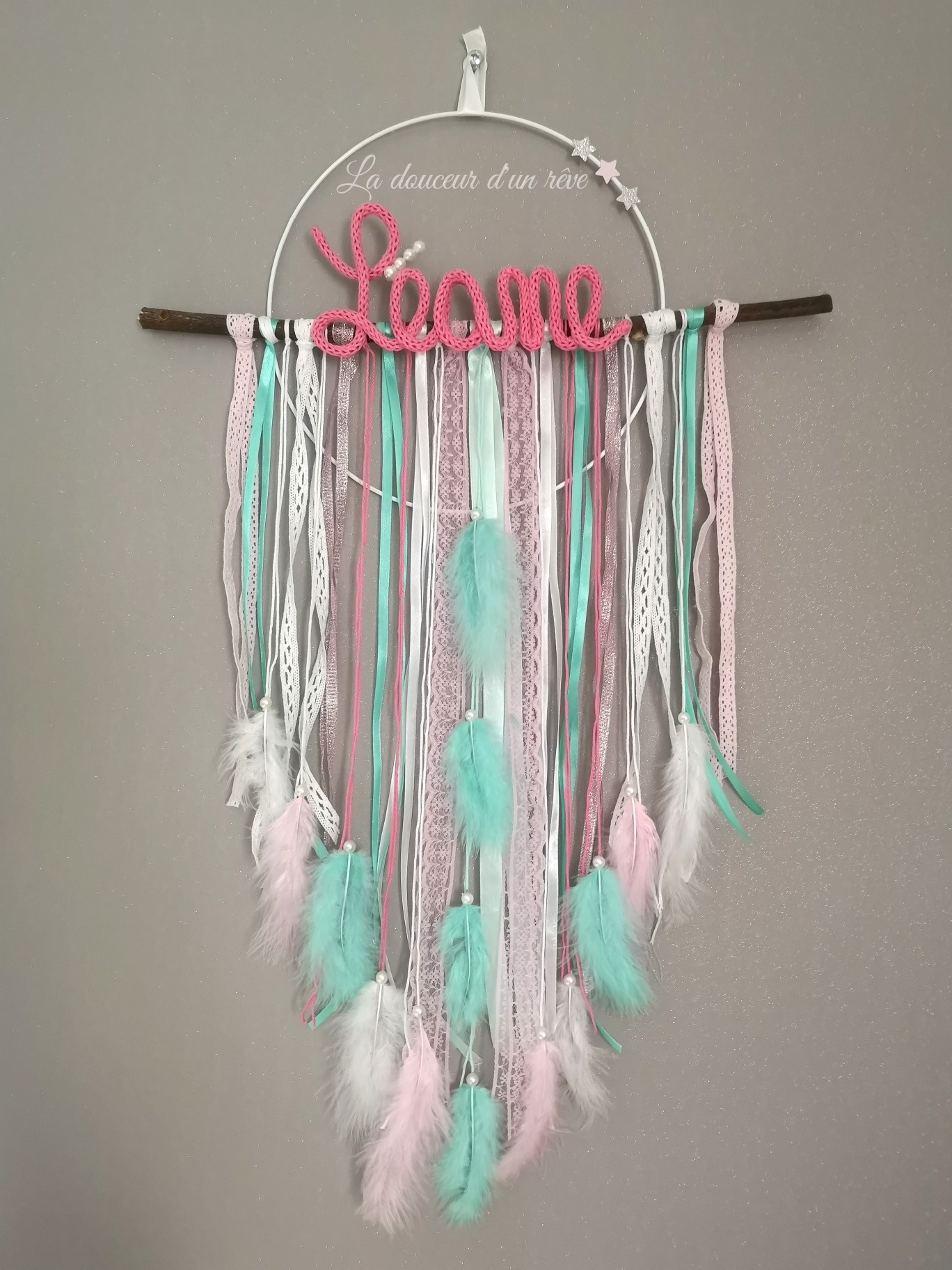 Suspension avec prénom en tricotin et cercle attrape rêve blanc de 25 cm de diamètre