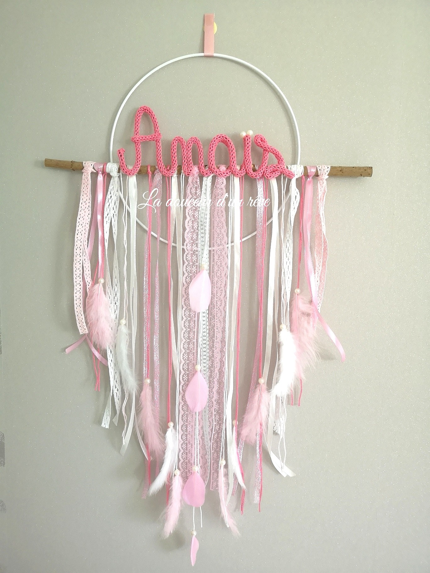 Suspension avec prénom en tricotin et cercle attrape rêve blanc de 25 cm de diamètre