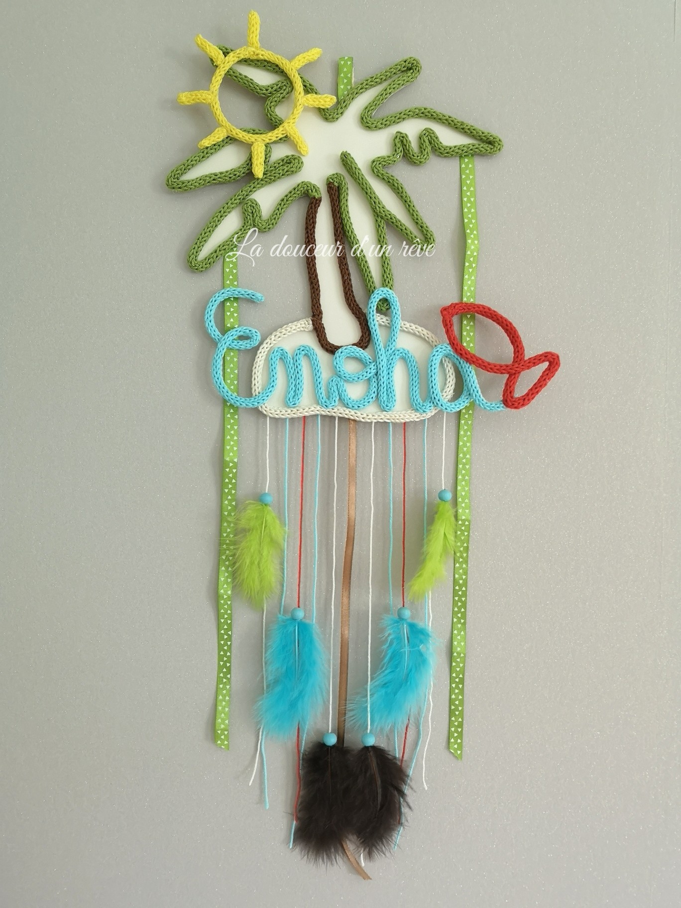 Attrape rêve Palmier avec soleil et un poisson en tricotin personnalisable