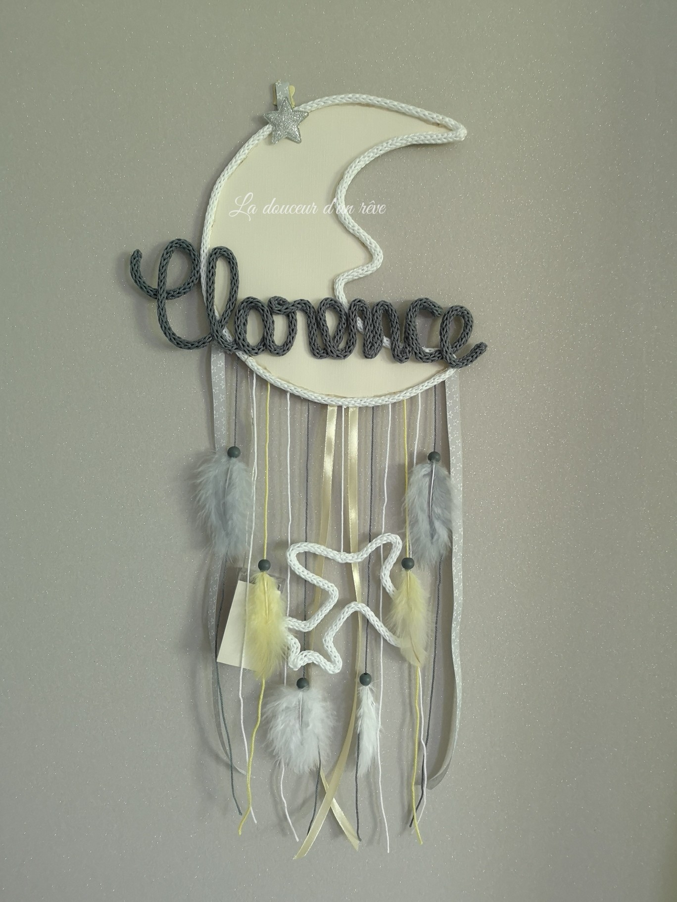 Attrape rêve Lune + avion au mileu de la descente en tricotin personnalisable.