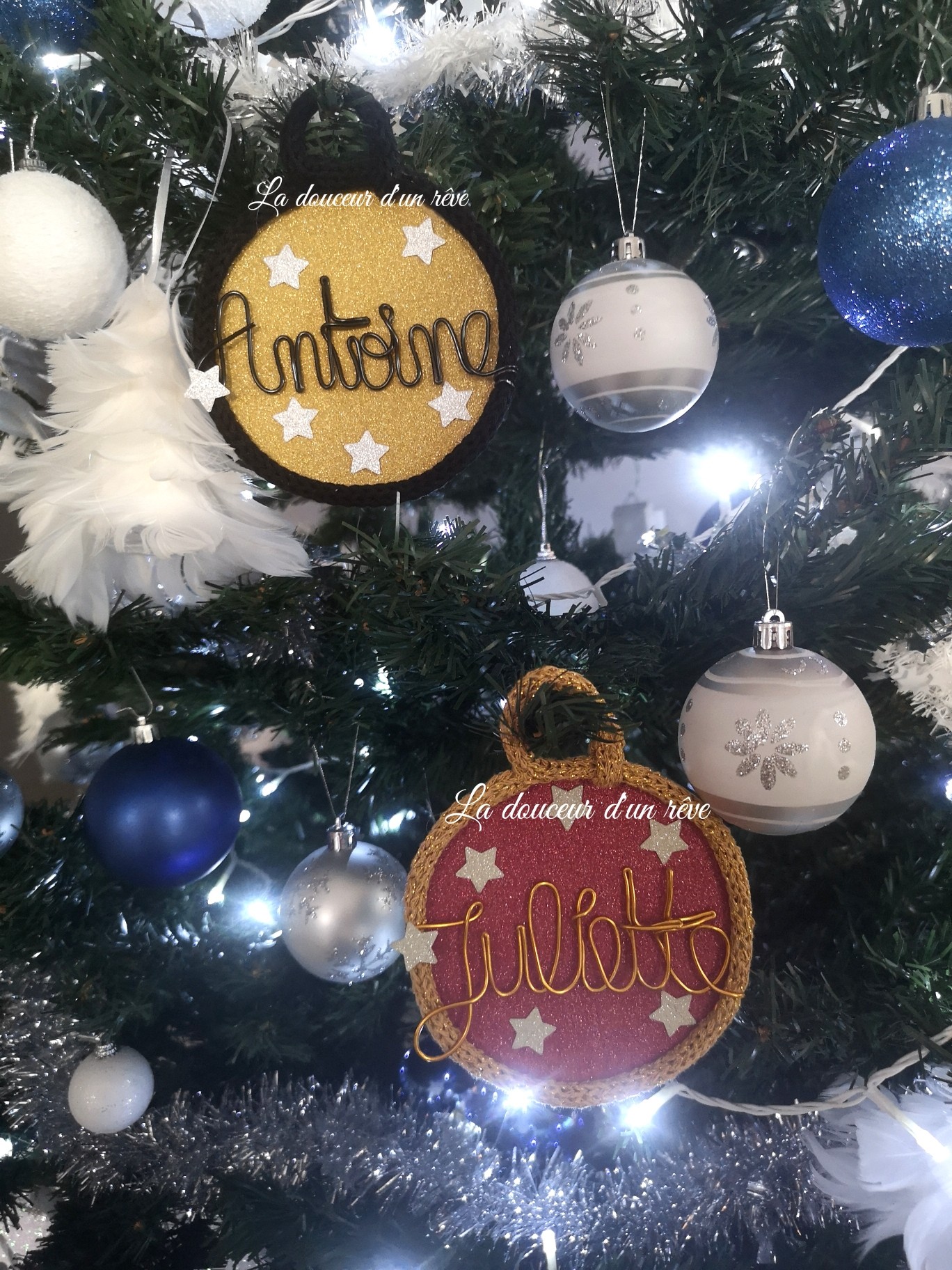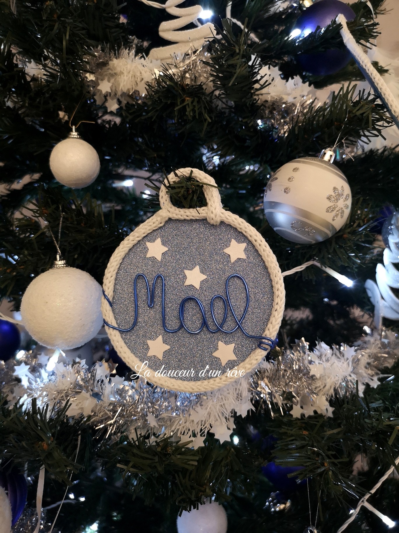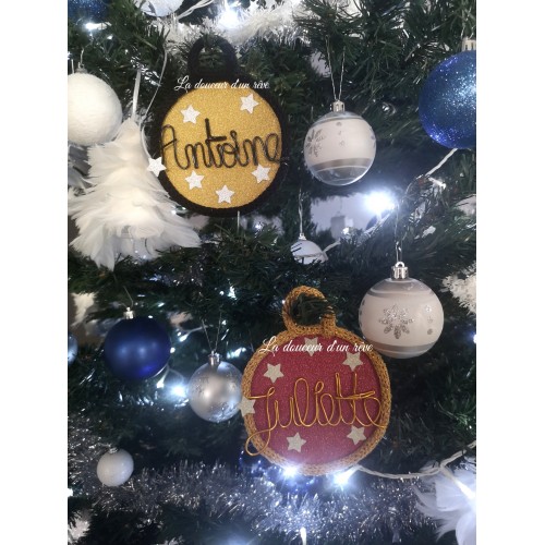 Boule de Noël en tricotin personnalisable avec prénom en fil aluminium