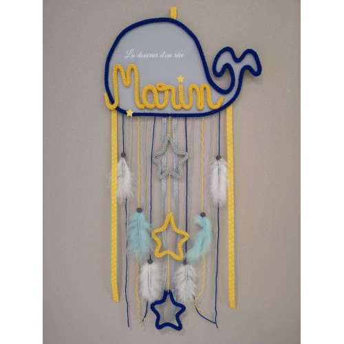 Attrape rêve "Baleine" prénom 6 lettres, et plus, tricotin, fille garçon strass leds cadeau plume surprise