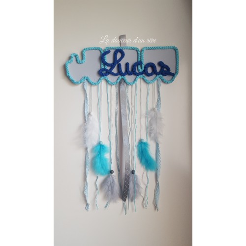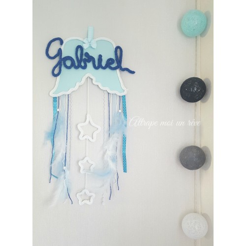 Attrape rêve "Nuage" prénom 6 lettres et plus, tricotin, ciel étoile lumineux leds cadeau de naissance