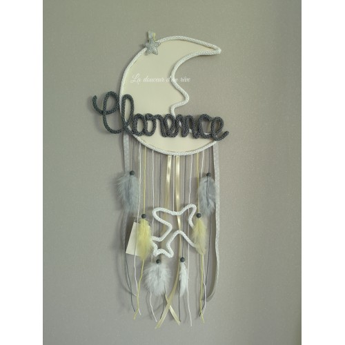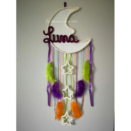 Attrape rêve "Lune" prénom 6 lettres et plus en tricotin, plume, décoration fille, garçon, étoile