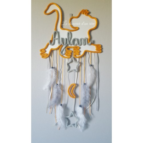 Attrape rêve "Chat" prénom 6 lettres et plus, en tricotin, animaux, décoration chambre enfant