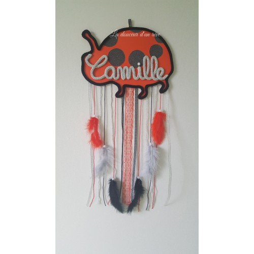 Attrape rêve "Coccinelle" prénom 6 lettres et plus, tricotin, naissance fait main décoration chambre fille garçon nouveau né