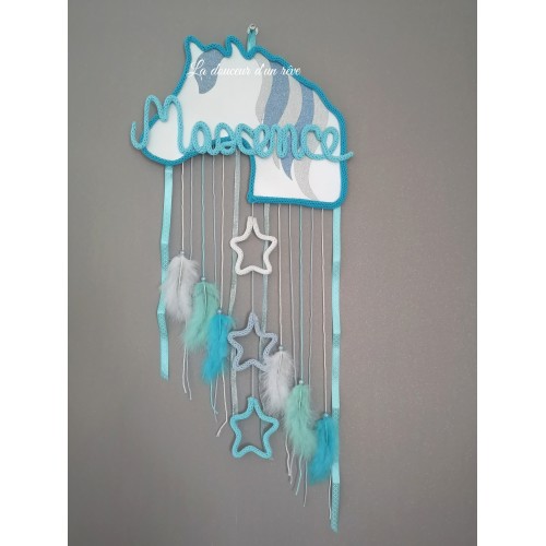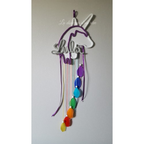 Attrape rêve "Licorne magique" prénom 6 lettres et plus, tricotin décoration cadeau original de naissance