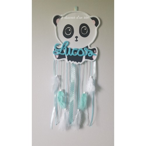 Attrape rêve "Panda" prénom 6 lettres et moins, en tricotin, naissance fille garçon