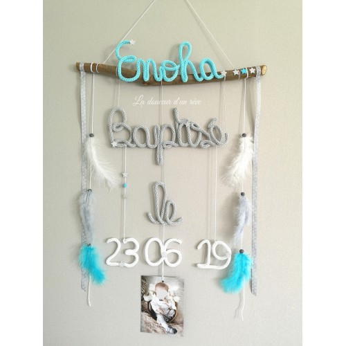 Suspension de baptême prénom en tricotin cadeau original avec photo